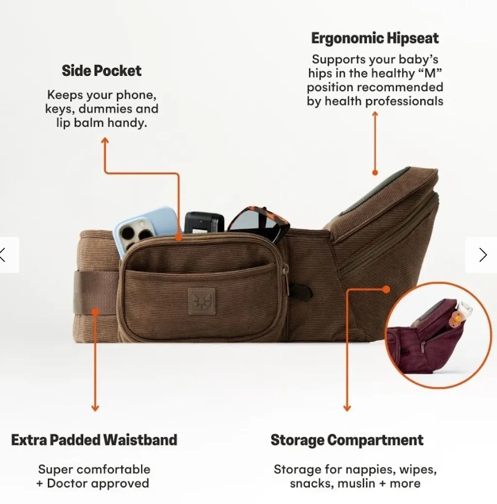 The O.G Australian-owned strap-free hipseat baby carrier and bum bag that takes the weight off your arms, shoulders and back. Built for quick ups, downs and everything in between, it’s comfy, luxurious and ready in seconds - perfect for newborns, babies and toddlers. The HipSurfer gives you the comfort of a baby carrier, the convenience of a bum bag and the freedom to carry your little one through every phase.