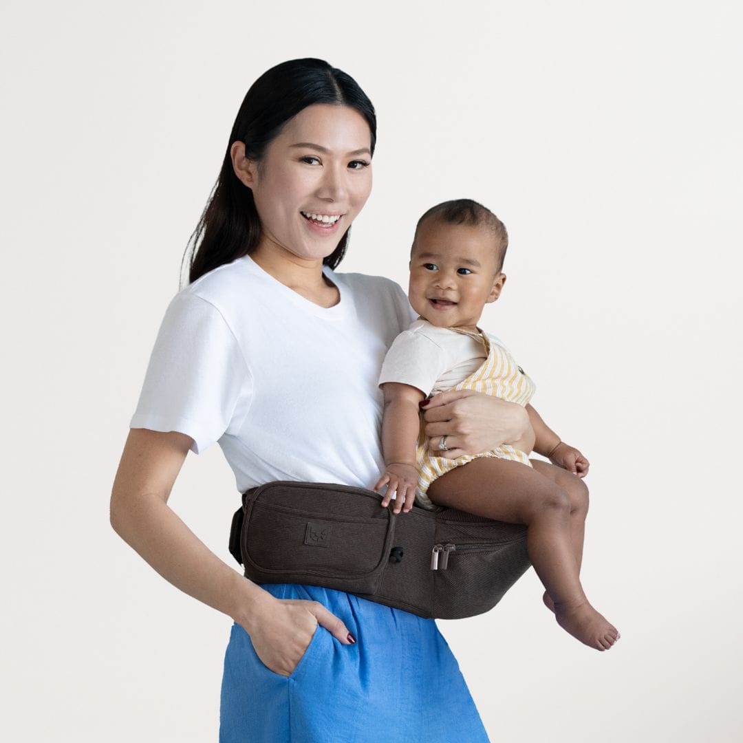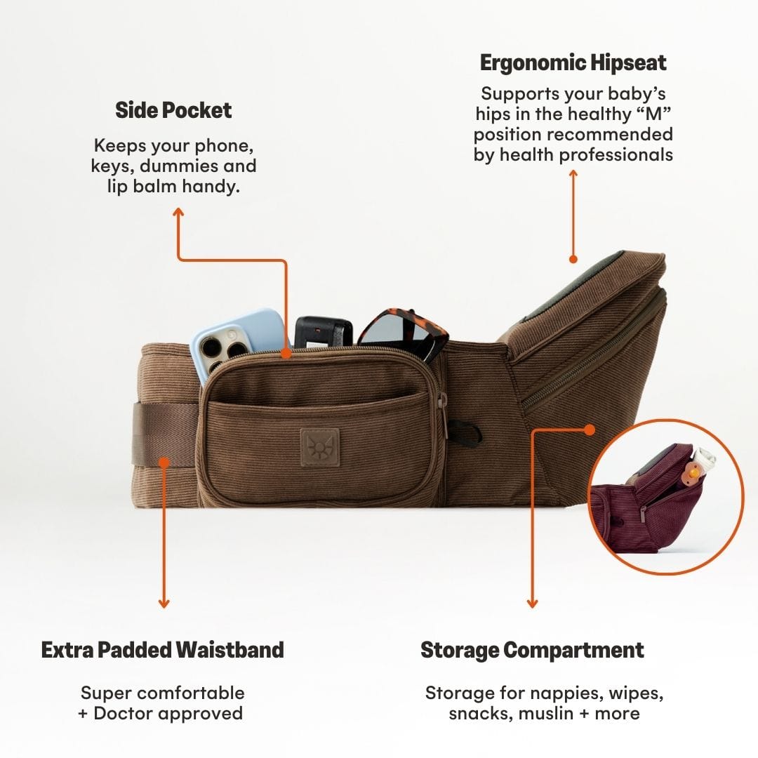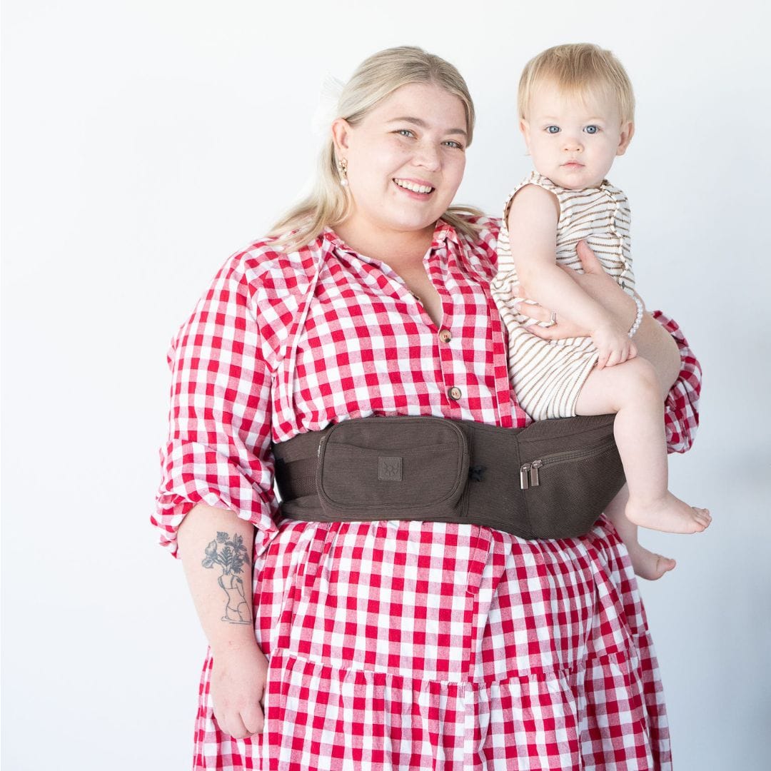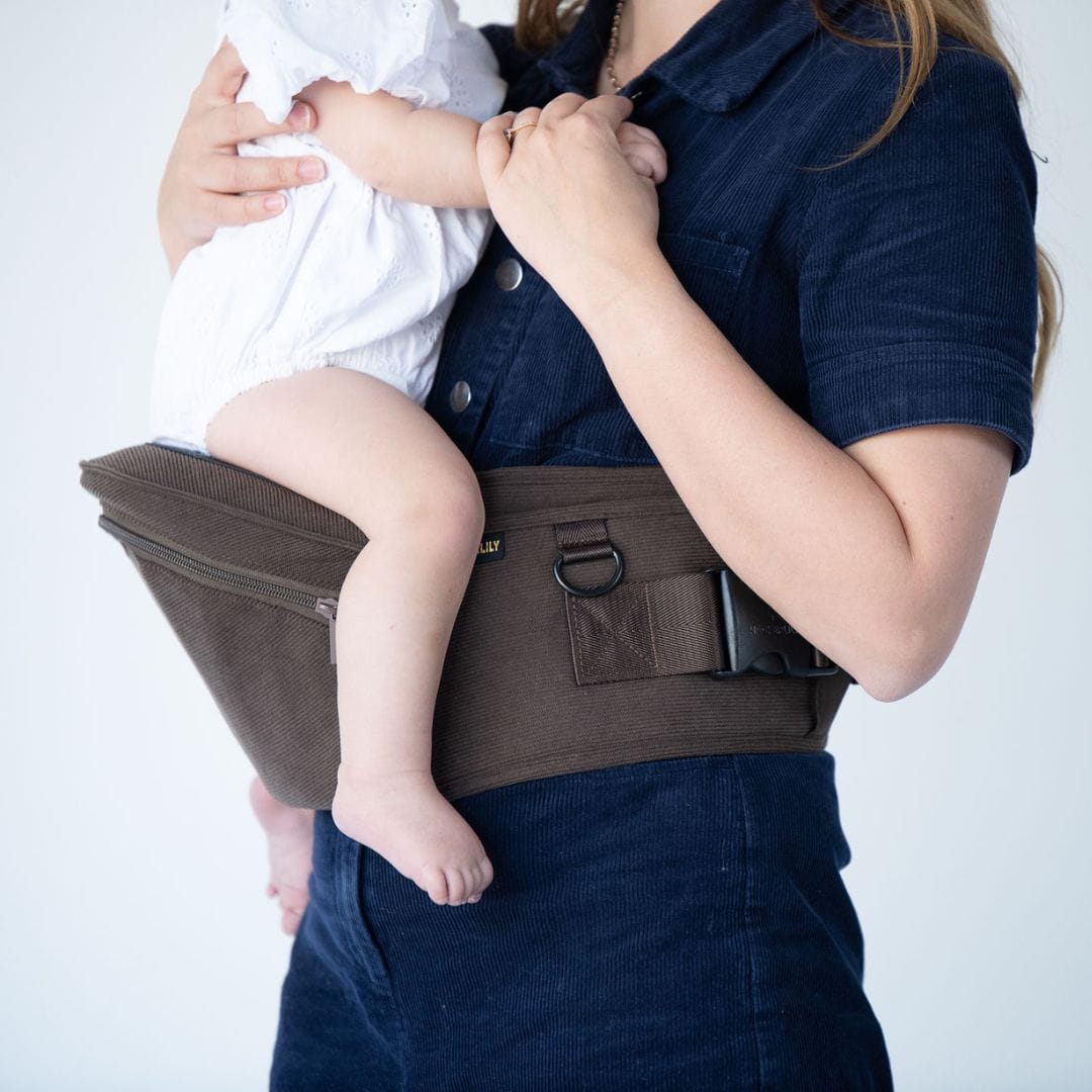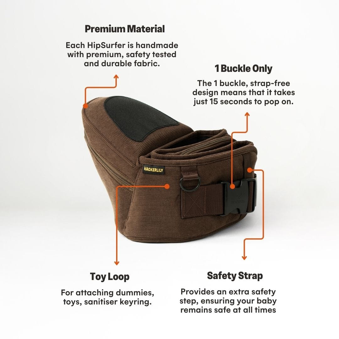 🤎 The Chocolate Corduroy HipSurfer – Our best-selling, strap-free carrier in a rich, chocolate corduroy finish. Designed to save your back, support your wrists, and look good while doing it. Stylish, supportive, and surprisingly compact – it’s the carrier that blends into your outfit, not shouts over it.
