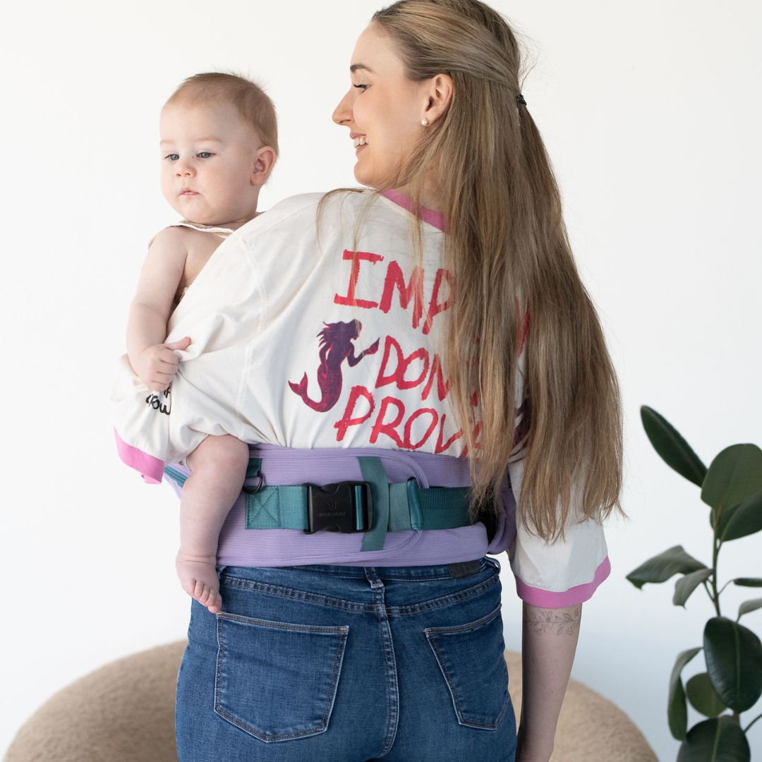 Babies can face forward in the HipSurfer once they have strong neck control, usually around 6 months old. This ensures their head and neck are supported, making it safe for them to explore the world around them while keeping you comfortable.